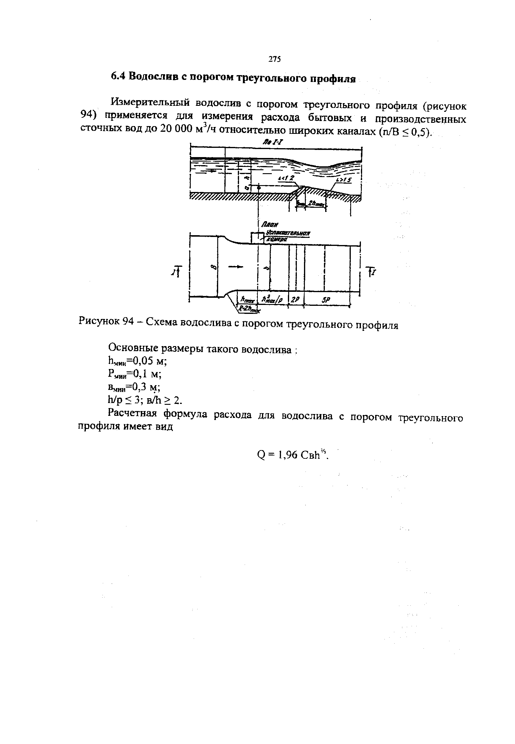 Измерительный водослив с порогом треугольного профиля (рисунок 94) применяется для измерения расхода бытовых и производственных сточных вод до 20 ООО м3/ч относительно широких каналах (п/В < 0,5).