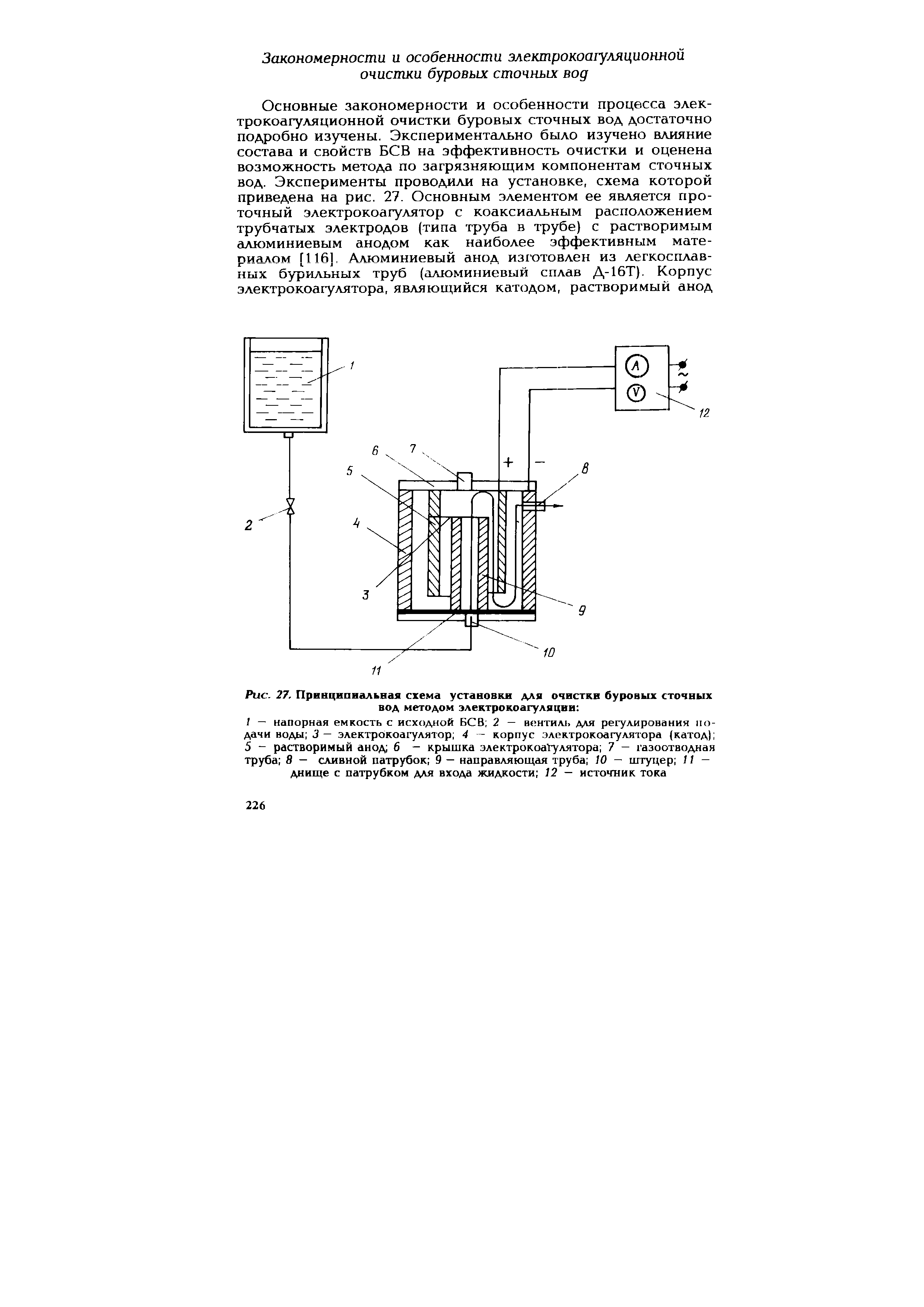 1 — напорная емкость с исходной БСВ; 2 — вентиль для регулирования подачи воды; 3 — электрокоагулятор; 4 — корпус электрокоагулятора (катод); 5 - растворимый анод; 6 — крышка электрокоагулятора; 7 — газоотводная труба; 8 — сливной патрубок; 9 — направляющая труба; 10 — штуцер; И — днище с патрубком для входа жидкости; 12 — источник тока