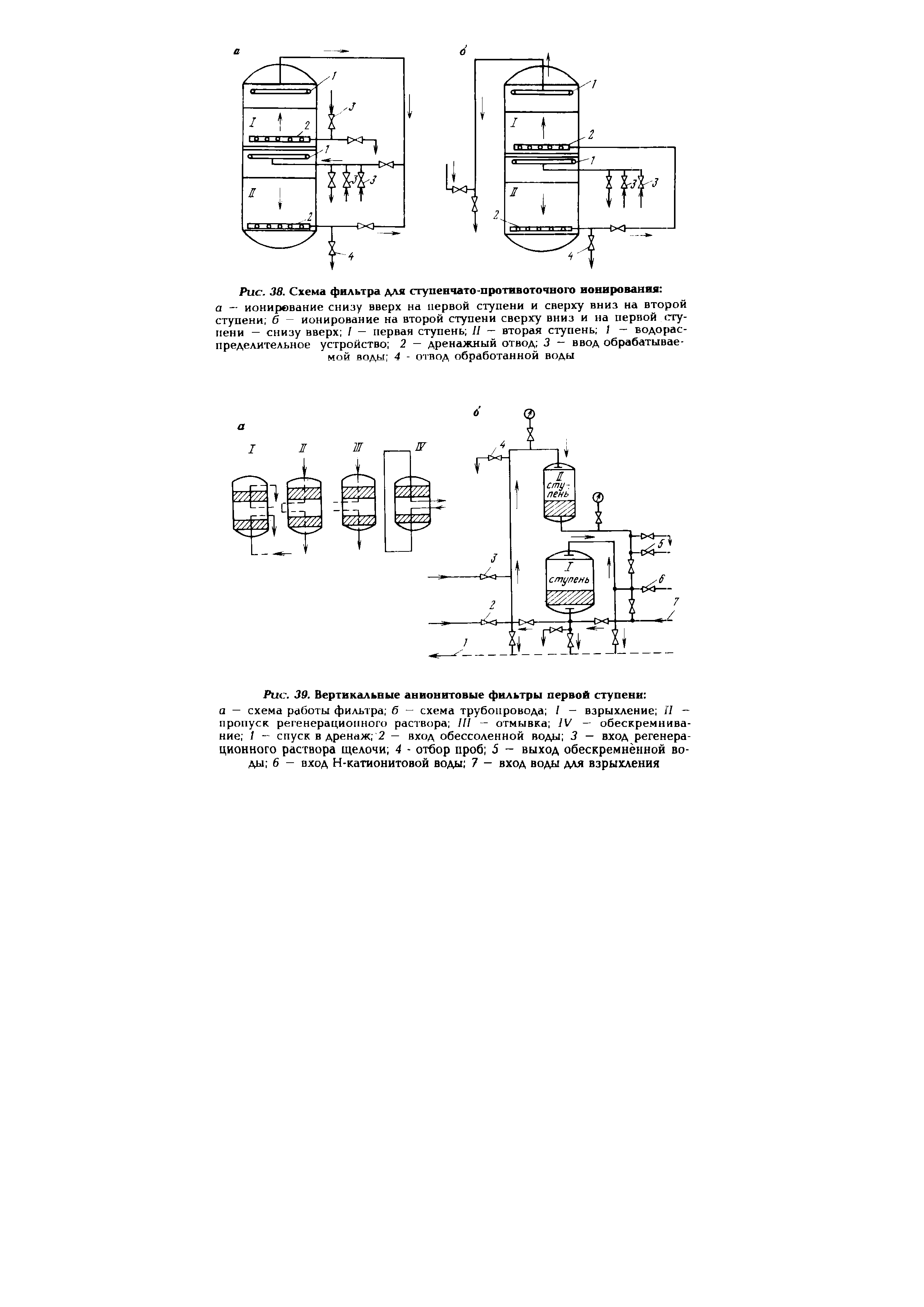 а — схема работы фильтра; б — схема трубопровода; / — взрыхление; П — пропуск регенерационного раствора; III - отмывка; IV — обескремнива-ние; / - спуск в дренаж; 2 — вход обессоленной воды; 3 — вход регенерационного раствора щелочи; 4 - отбор проб; 5 - выход обескремнённой воды; 6 - вход Н-катионитовой воды; 7 - вход воды для взрыхления