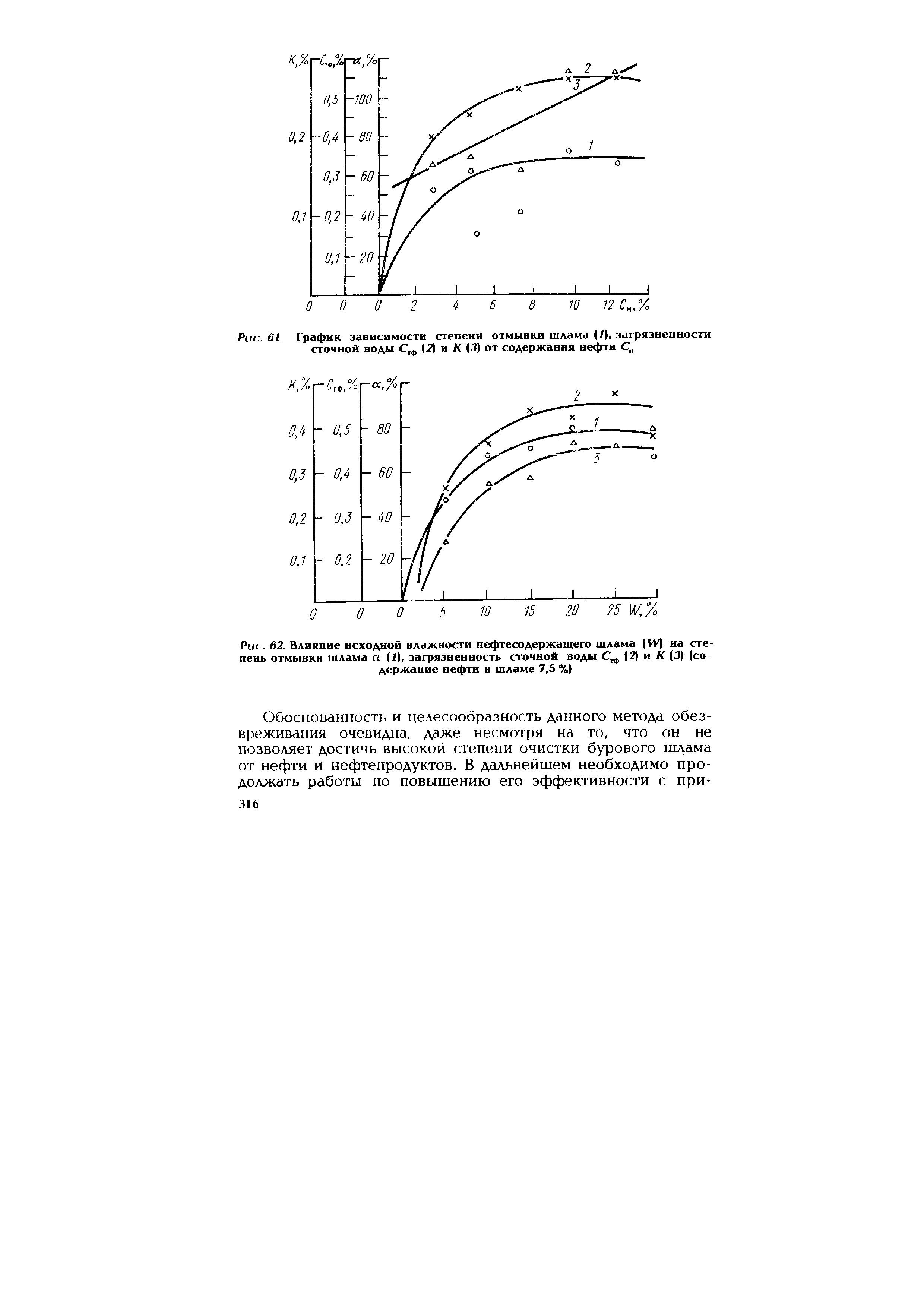 Результаты исследований влияния содержания нефти в исходном шламе на степень отмывки водой показаны на рис. 61. Из полученных данных видно, что при содержании нефти более 5 % степень отмывки практически не изменяется и составляет в среднем 70 — 75%. Загрязненность сточных вод взвешенными веществами возрастает при увеличении содержания нефти до 5 %, а затем стабилизируется и остается на одном уровне (см. рис. 61).