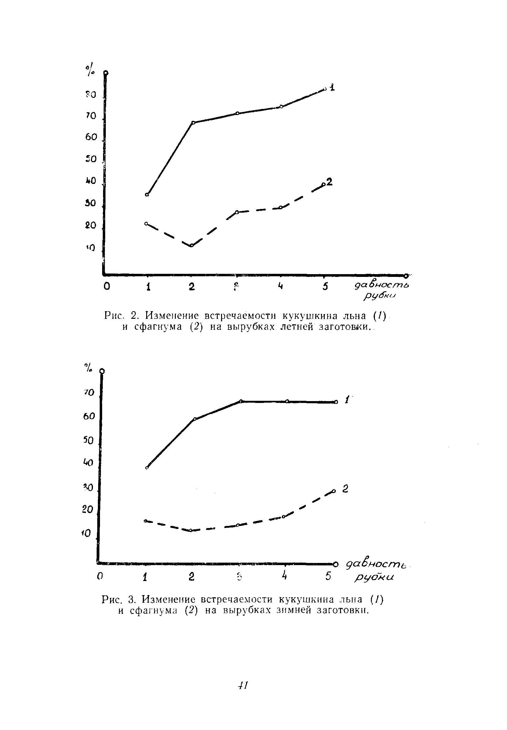Рис. 3. Образование долгомошной вырубки. Ичмонеиие площади, занятой кукушкиным льном после рубки по влажном ельнике-черничнике. Конецгорское лесничество Виноградовского лесхоза Архангельской области.~~На вырубках зимней заготовки встречаемость кукушкина льна в первый год после рубки также уменьшается, но в меньшей мере, чем на летних (до 42%). На второй и третий год происходит увеличение ее до 69%. В дальнейшем рост встречаемости прекращается (рис. 3). Это может быть объяснено тем, что все места, пригодные для поселения кукушкина льна, занимаются им в первые три года. В дальнейшем происходит лишь медленное расширение площади, занятой этим мхом, что слабо отражается на встречаемости. Для сфагнума изменение встречаемости происходит аналогично изменению ее на летних вырубках. На пятый год после рубки она достигает 31%.