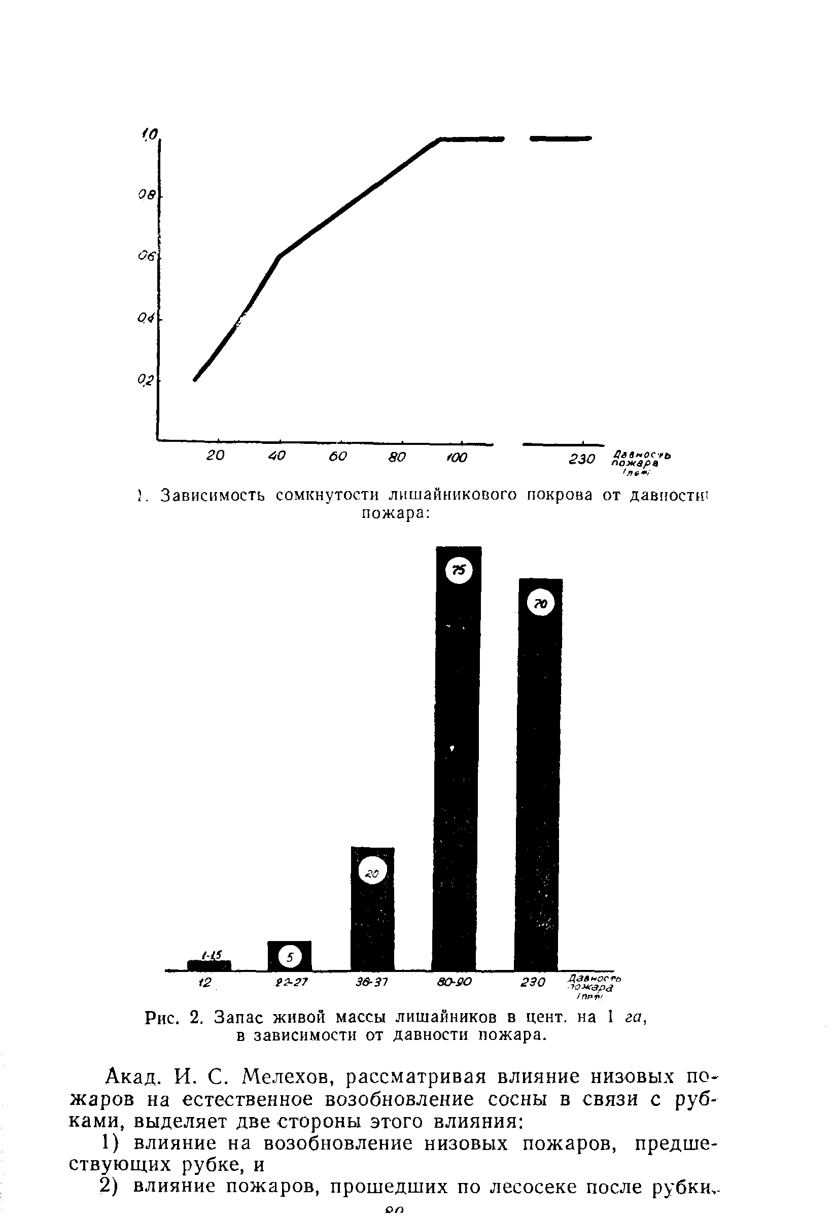 Запас живой массы лишайников в цент, на 1 га, в зависимости от давности пожара.