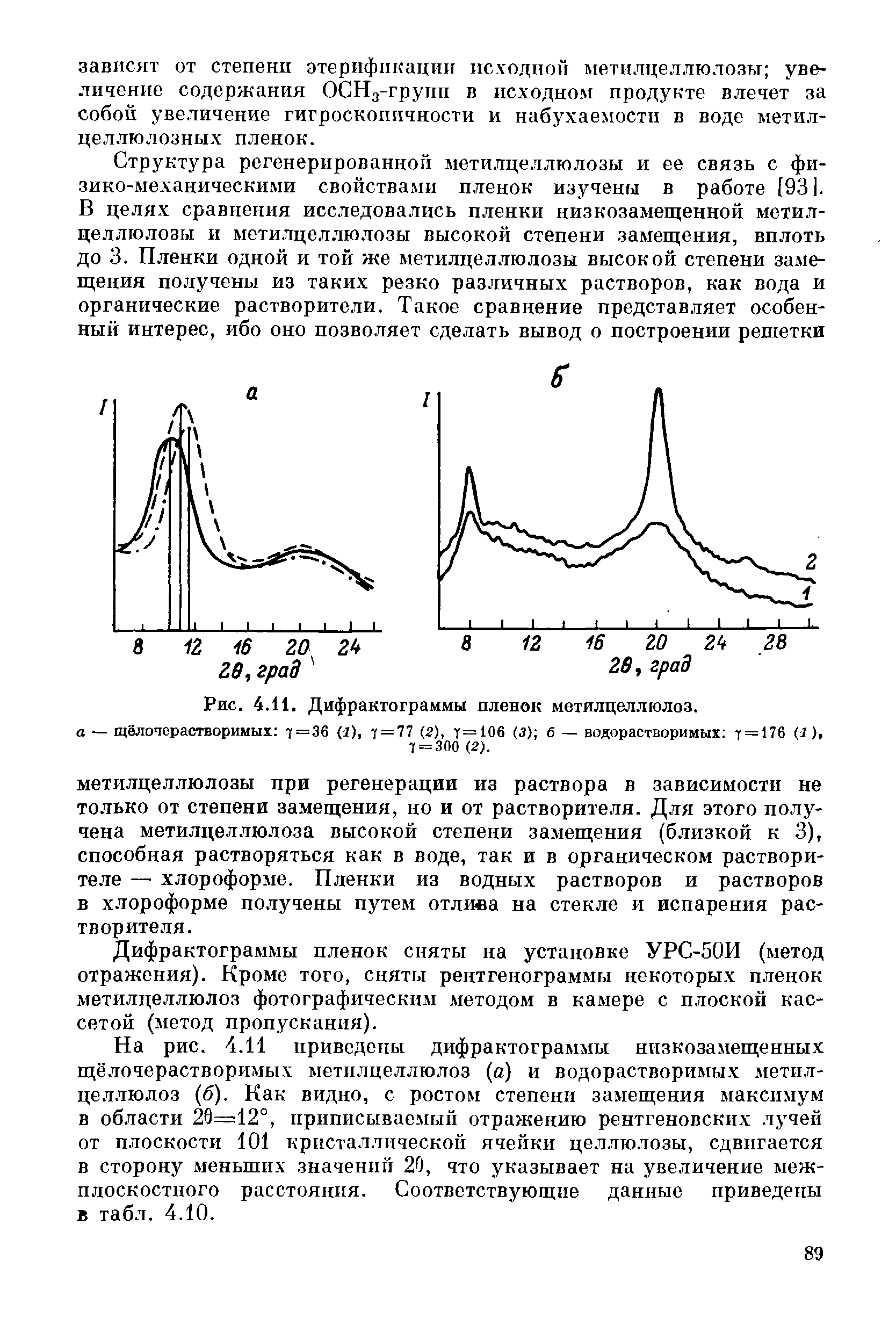 На рис. 4.11 приведены дифрактограммы низкозамещенных щёлочерастворимых метилцеллюлоз (а) и водорастворимых метилцеллюлоз (б). Как видно, с ростом степени замещения максимум в области 29=12°, приписываемый отражению рентгеновских лучей от плоскости 101 кристаллической ячейки целлюлозы, сдвигается в сторону меньших значений 20, что указывает на увеличение меж-плоскостного расстояния. Соответствующие данные приведены в табл. 4.10.