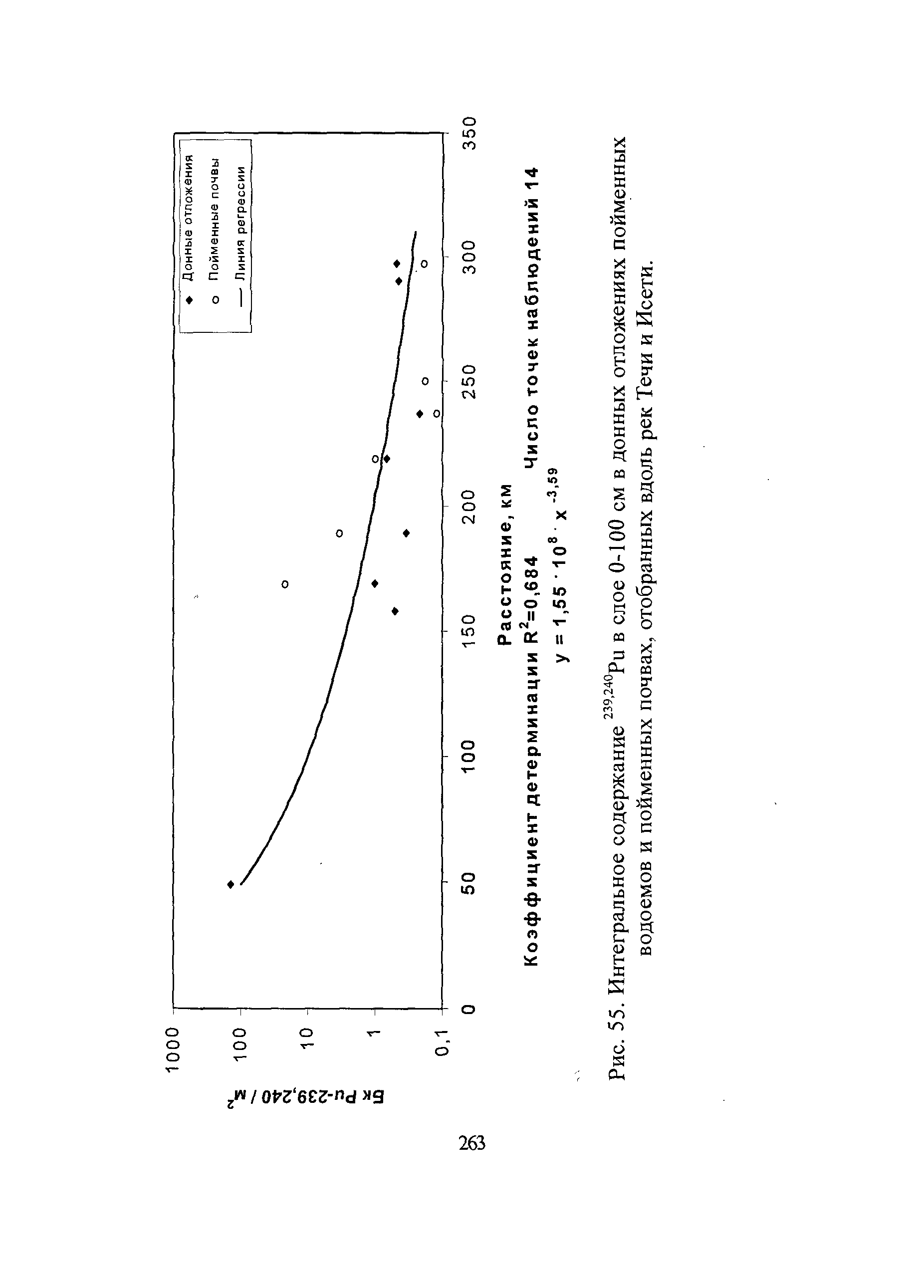 Интегральное содержание 239,240Ри в слое 0-100 см в донных отложениях пойменных водоемов и пойменных почвах, отобранных вдоль рек Течи и Исети.