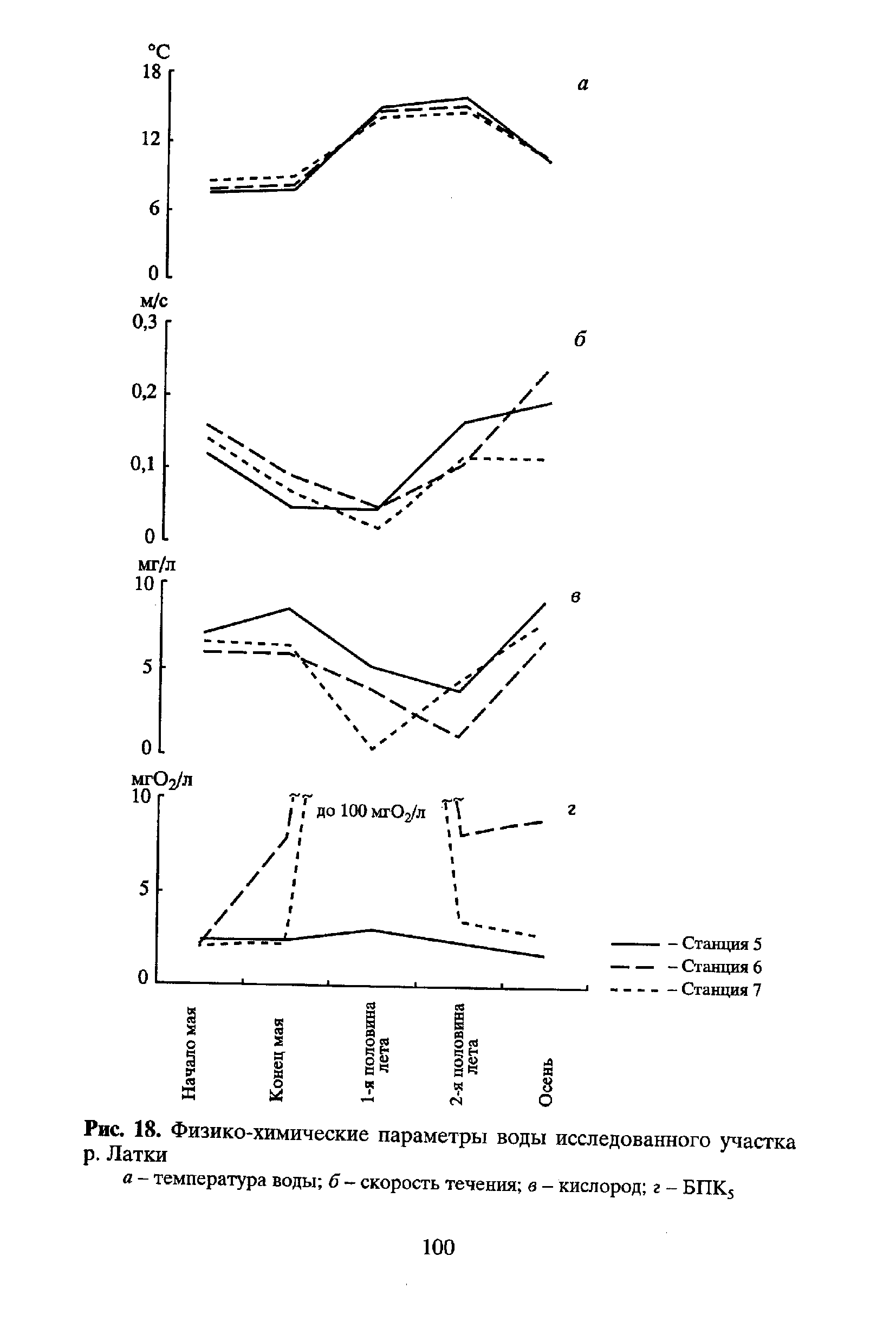 На исследованном участке р. Латка характеризуется как медленнотекущая (рис. 18, а). Лишь в отдельные сезоны вегетационного периода на некоторых участках скорость течения увеличивалась. Чаще всего это происходило осенью - из-за дождевого паводка скорость потока особенно увеличивалась на станциях € (и 7.