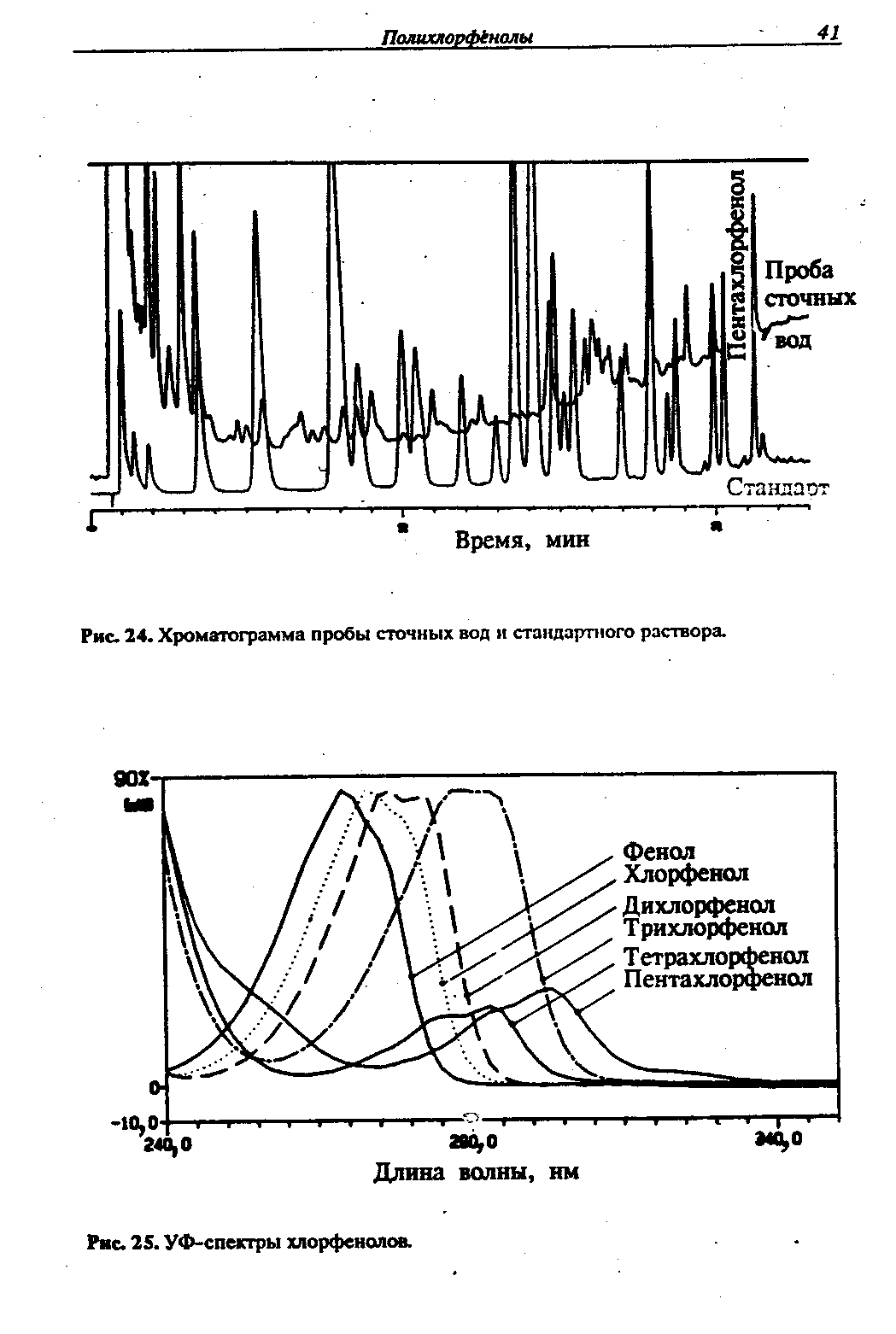 На рис. 24 приведена хроматограмма пробы сточных вод (после 20-кратного концентрирования), на которую наложена хроматограмма стандартней смеси. В анализируемой пробе может присутствовать множество компонентов, вследствие чего идентификация пиков только по временам удерживания может быть затруднена. В этом слуЧае следует прибегнуть к сравнению спектров.