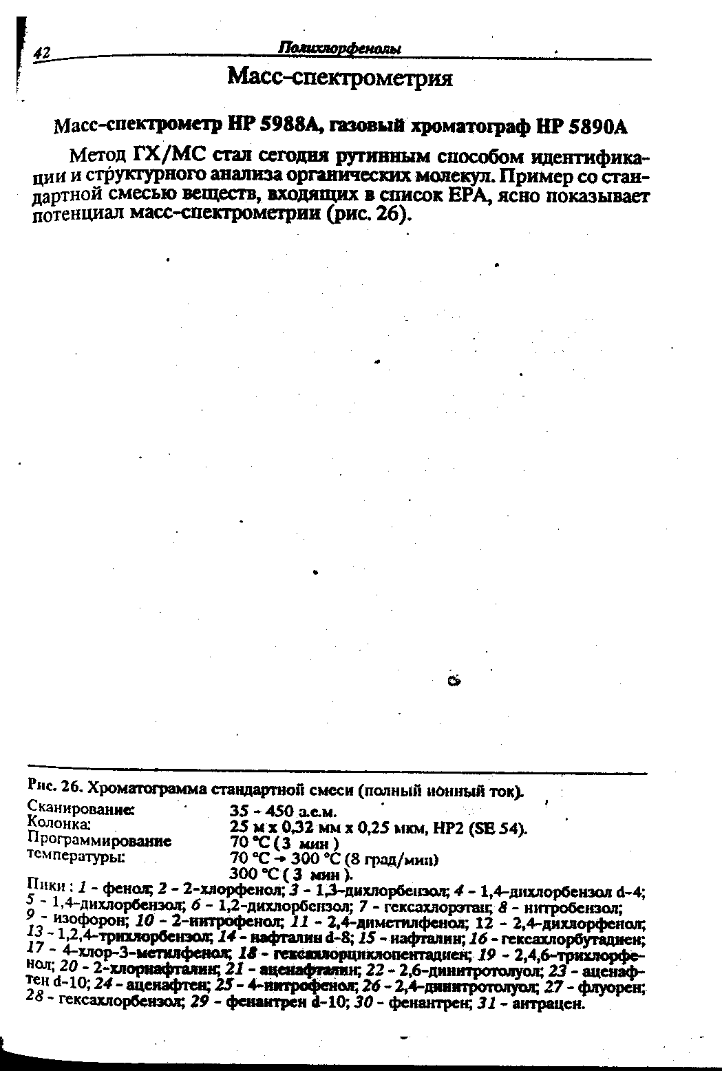 Метод ГХ/МС стал сегодня рутинным способом идентификации и структурного анализа органических молекул. Пример со стандартной смесью веществ, входящих в список ЕРА, ясно показывает потенциал масс-спектрометрии (рис. 26).