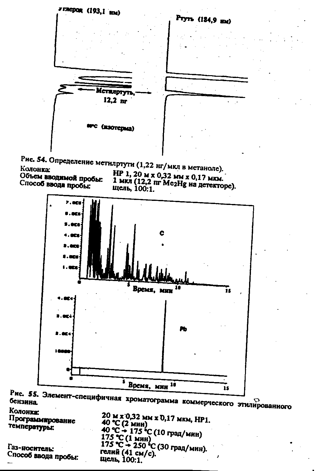 Соединения металлов можно детектировать при помощи эле-мент-селективного АЭД. Этот метод особенно подходит в случае металлооргацических соединений, поскольку углерод определяется так же хорошо, как и металлы. На рис. 54 приведена хроматограмма пробы метил ртути.
