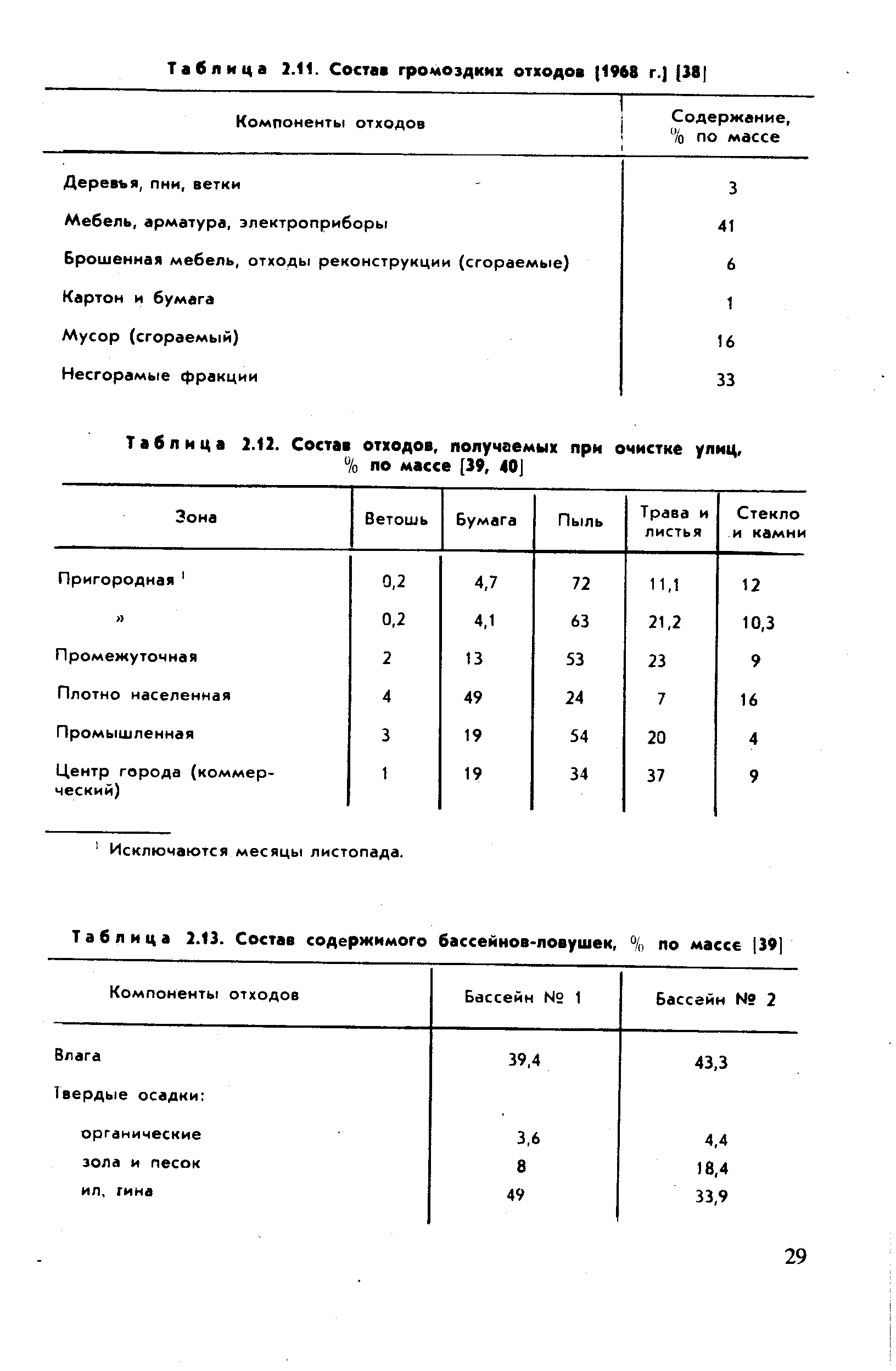 Материал, который может быть собран при уборке улиц, отлагается после дождя в бассейнах-ловушках систем коллектора для сброса дождевых вод. Состав этих твердых отходов, как и остаток после уборки, очень разнообразен (табл. 2.13).