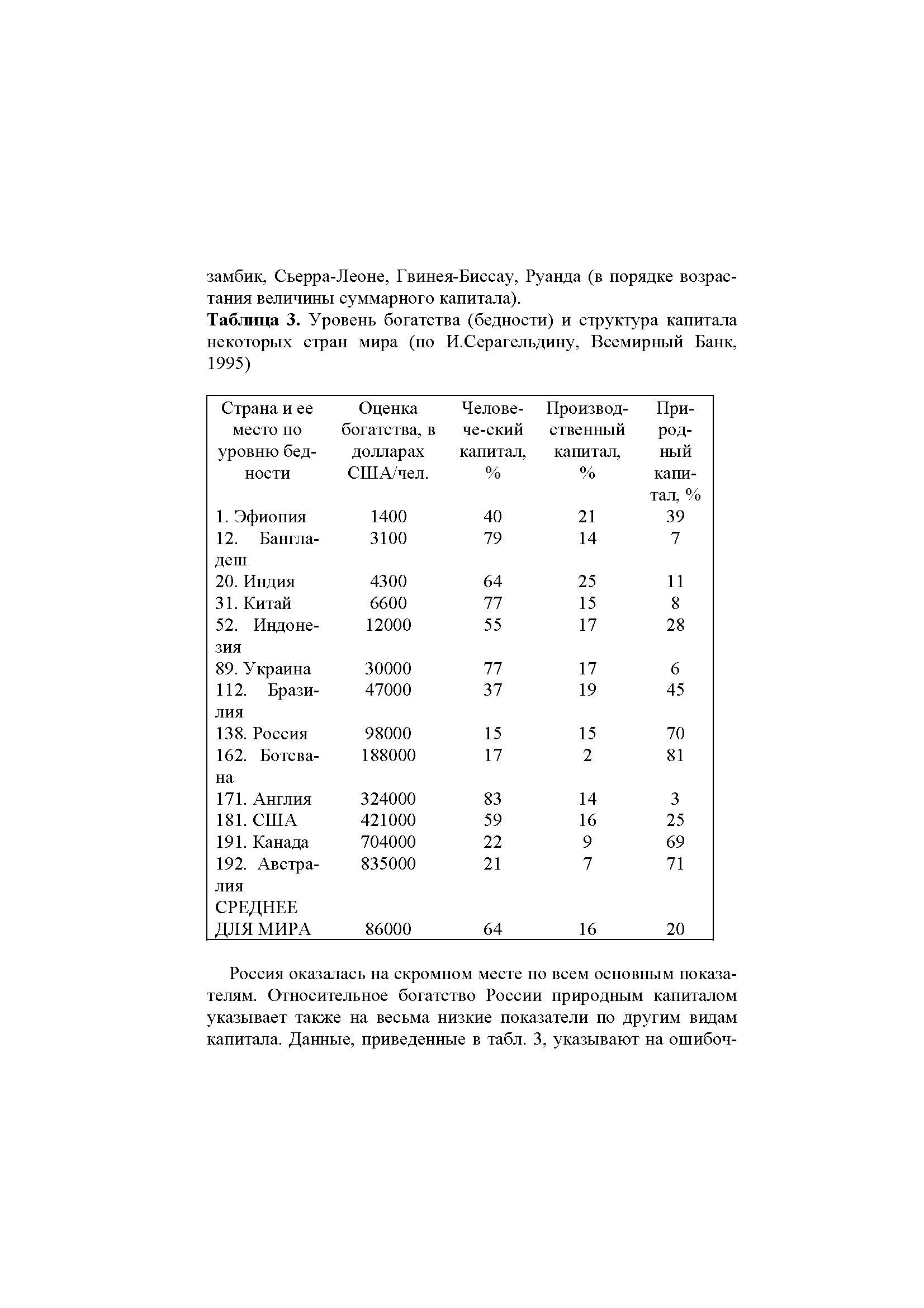 Несмотря на приблизительность и спорность методики этих расчетов, они дают представление о том, из чего складывается богатство стран и какую роль в этой композиции играет природный капитал. Мы должны также помнить, что наряду с трудовыми затратами, природные ресурсы были важнейшим источником накапливаемого богатства стран, в том числе за счет зависимых или находившихся в зависимости стран. В табл. 3 содержатся соответствующие данные (на душу населения) для 13 стран: самой бедной (Эфиопия), десяти избранных нами крупных стран, включая Россию, и двух самых богатых (Канада и Австралия).